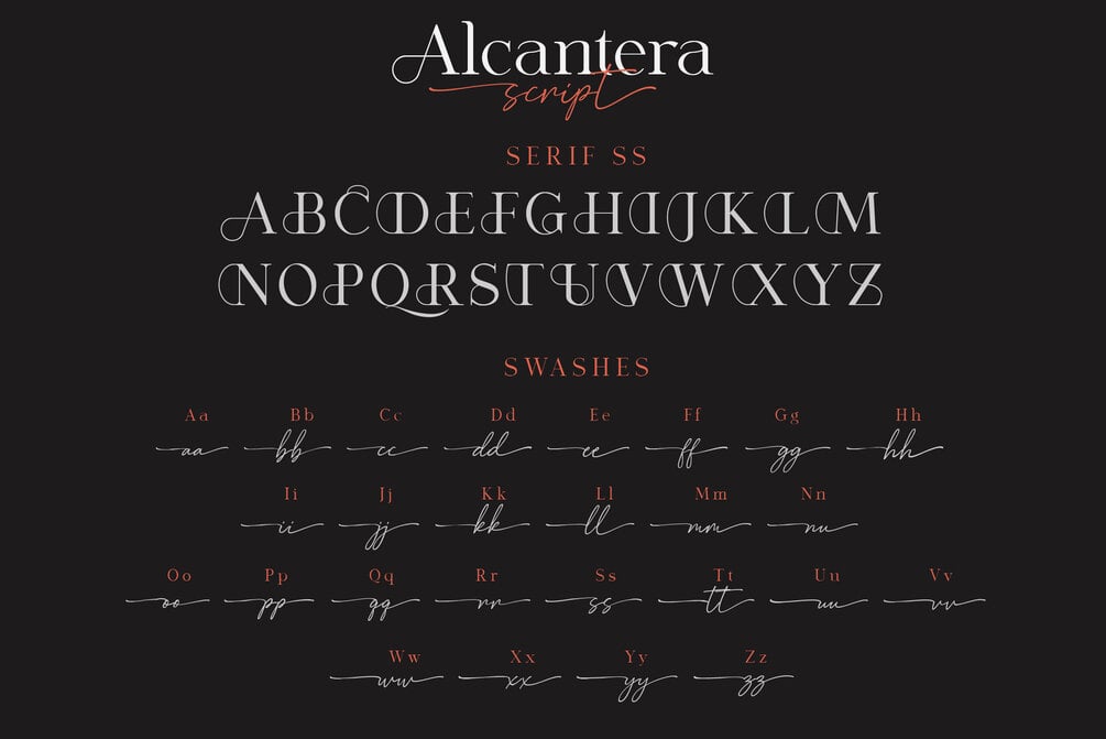 File Included: Alcantera Script, Serif, Swashes, Serif SS ( OTF, TTF, WOFF )