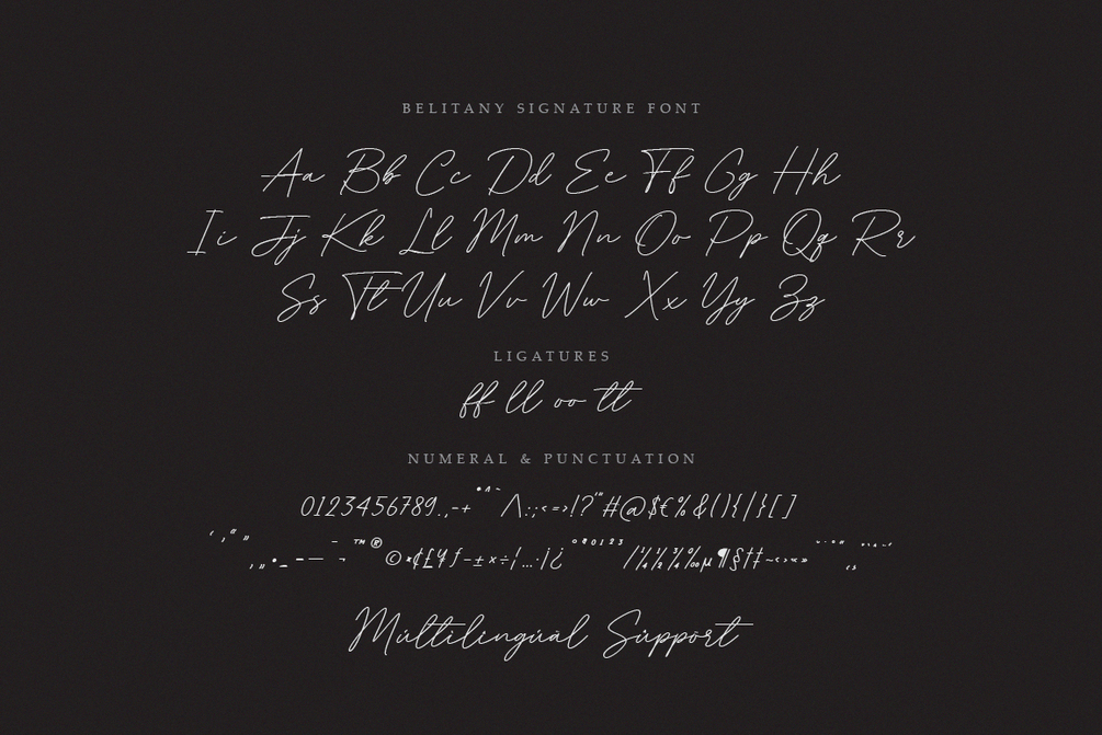 Belitany Signature is a sleek, handwritten font with a distinctive signature style. Its elegant and refined strokes bring a personal and sophisticated feel to your designs. Whether it's for logos, invitations, marketing materials, or other design projects that call for a unique handwritten touch, Belitany Signature adds an exclusive and graceful flair.