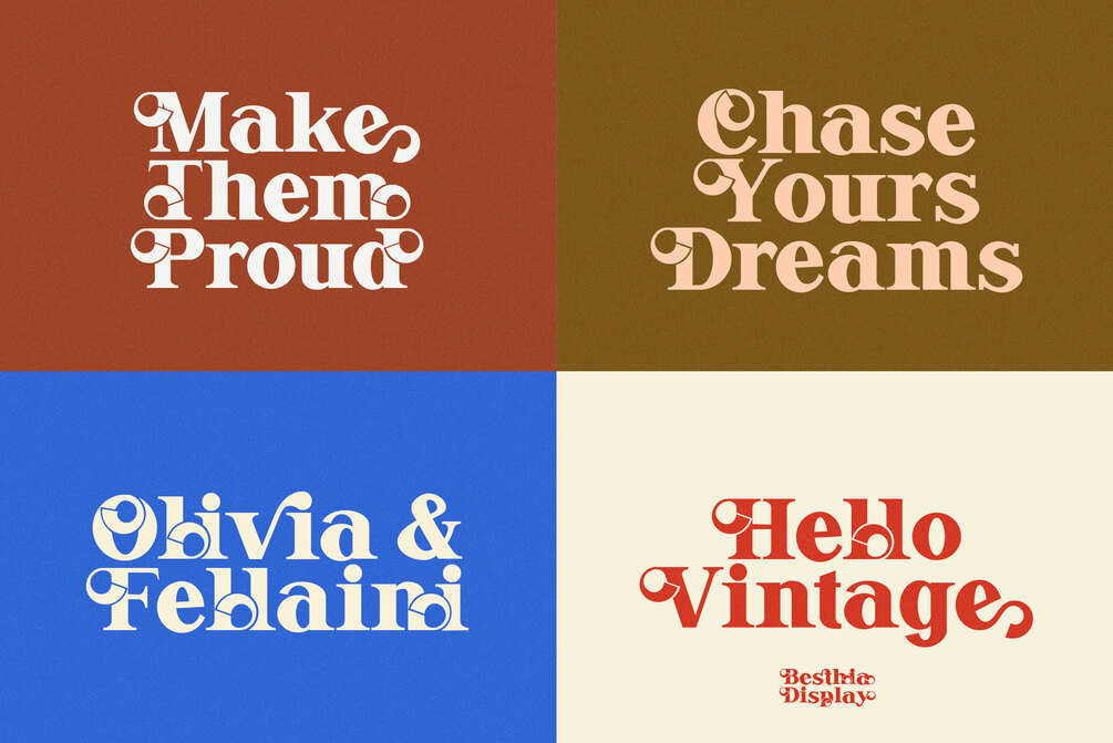 Besthia Display is a stylish vintage font vibe with a touch of modernity. It looks amazing at display sizes and is easily readable in text size. Besthia Display comes with access to your OpenType features, large selection of stylistic alternate glyphs and ligatures.