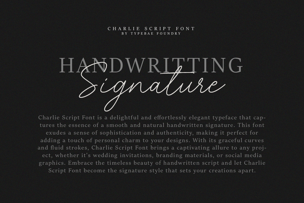 Charlie Script is a delightful and effortlessly elegant typeface that captures the essence of a smooth and natural handwritten signature. This font exudes a sense of sophistication and authenticity, making it perfect for adding a touch of personal charm to your designs. Embrace the timeless beauty of handwritten script and let Charlie Script Font become the signature style that sets your creations apart.