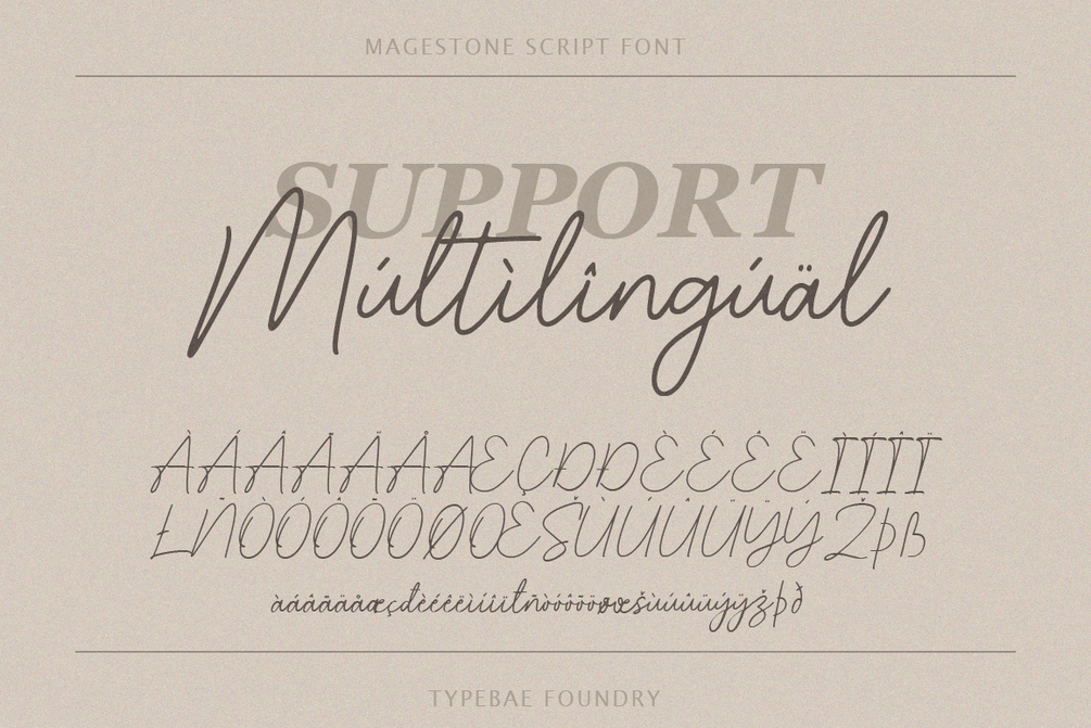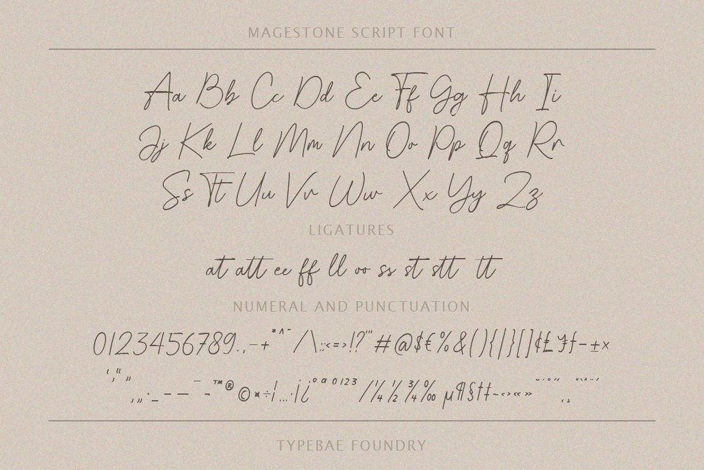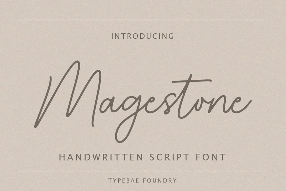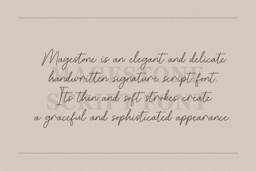 Magestone is an elegant and delicate handwritten signature script font. Its thin and soft strokes create a graceful and sophisticated appearance. It exudes a sense of refinement and uniqueness, making it an ideal choice for branding, invitations, logos, and other creative projects where a touch of elegance is desired.