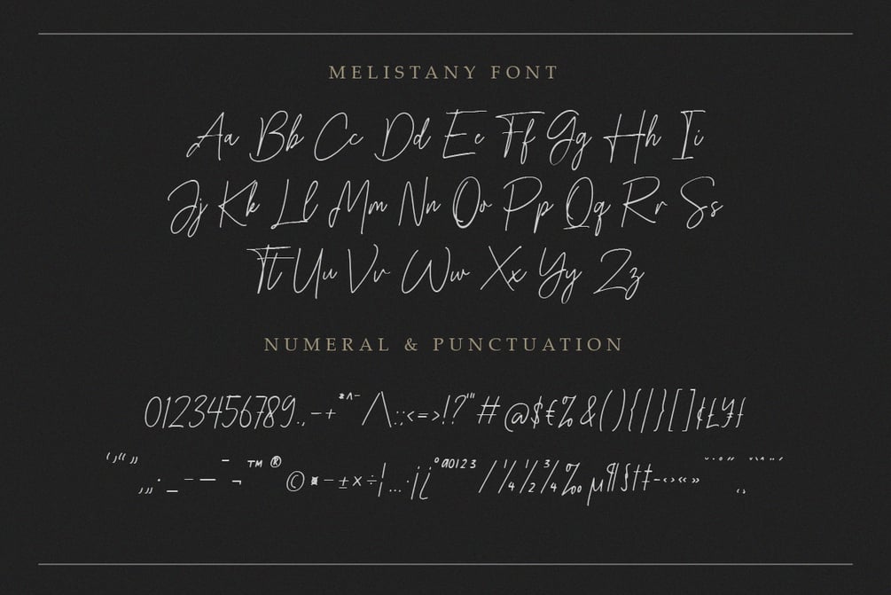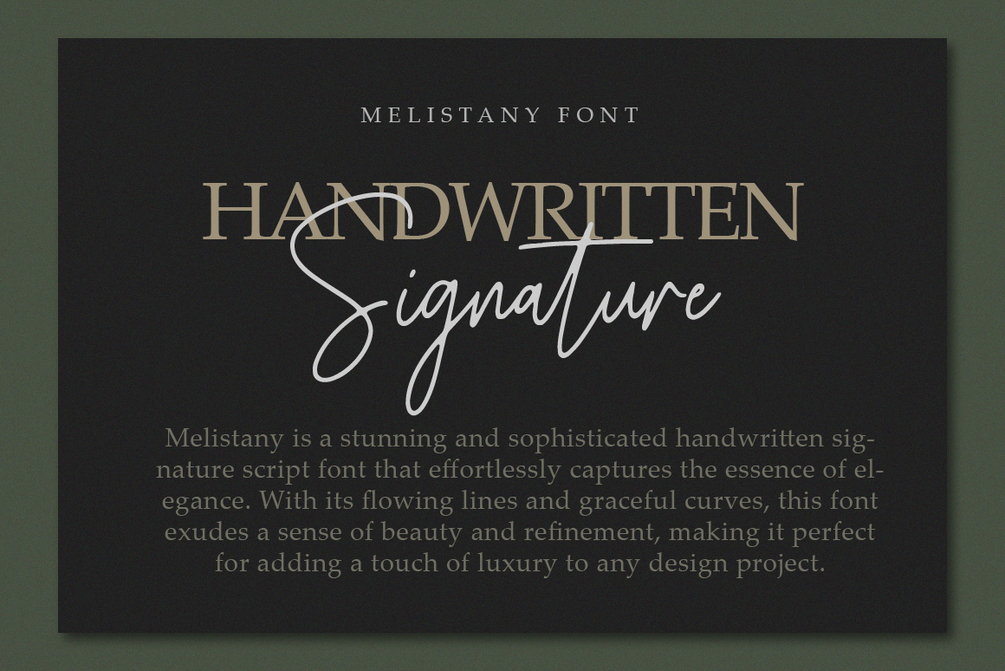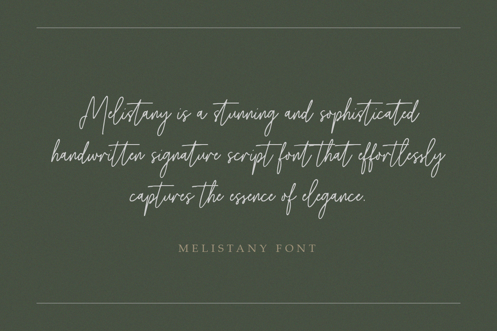 Melistany is a stunning and sophisticated handwritten signature script font that effortlessly captures the essence of elegance. With its flowing lines and graceful curves, this font exudes a sense of beauty and refinement, making it perfect for adding a touch of luxury to any design project.