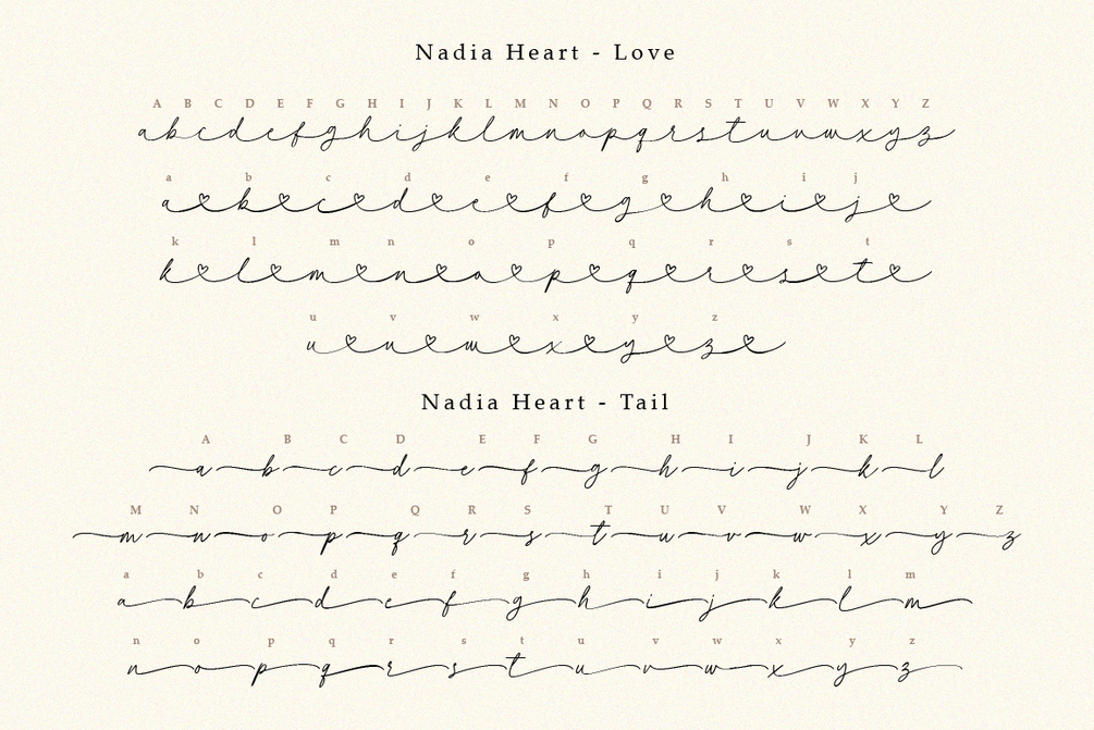 Nadia Heart Font is a lovely handwritten script font that emanates elegance. It has enthralling tails at the beginning and conclusion of each stroke and captivating letter alternatives. The font's distinguishing feature is its heart-shaped connecting tail, which lends a romantic and charming touch. Nadia Heart Font will fascinate and inspire you with its delicate style.