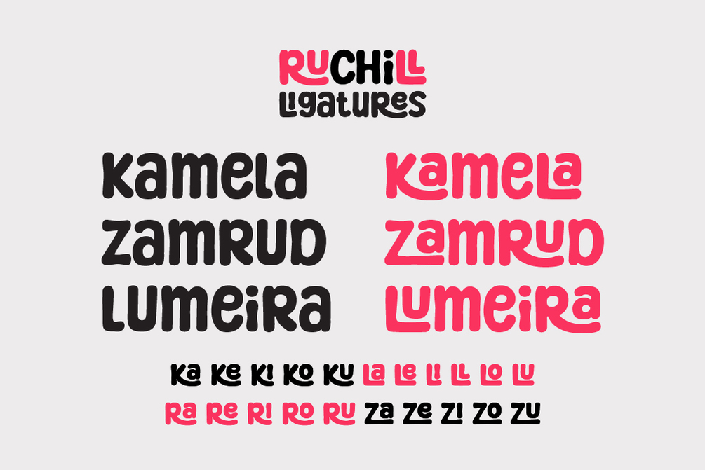 Ruchill is a playful display font packed with cool ligatures. Its unique ligatures add a fun, cheerful, and edgy vibe to any design.