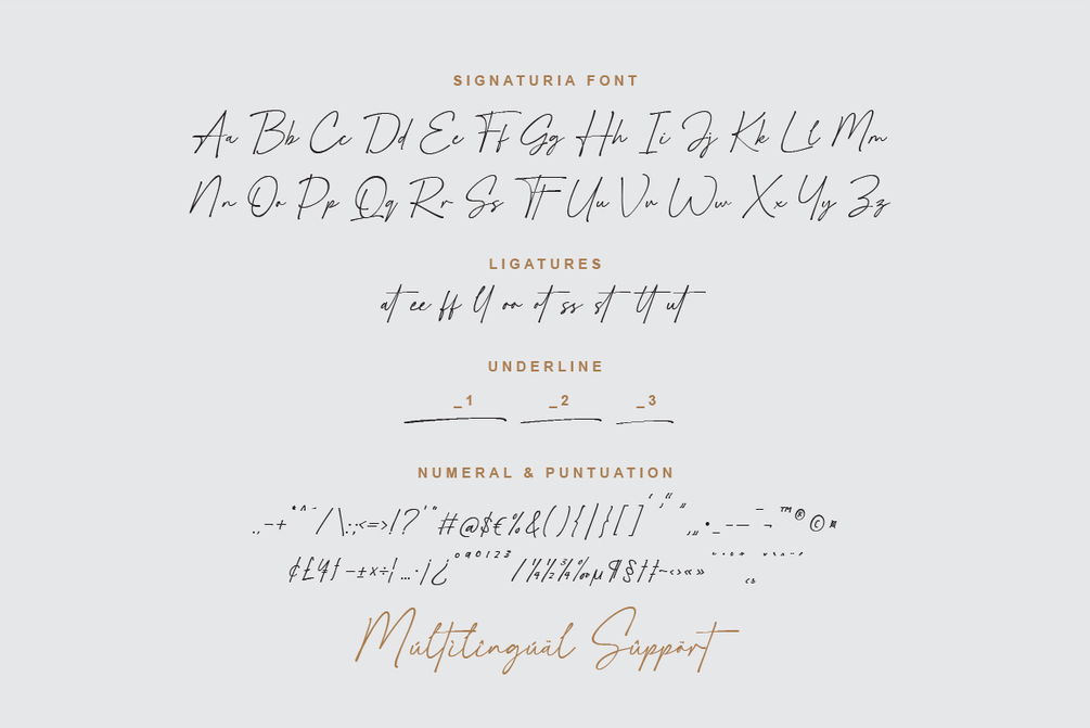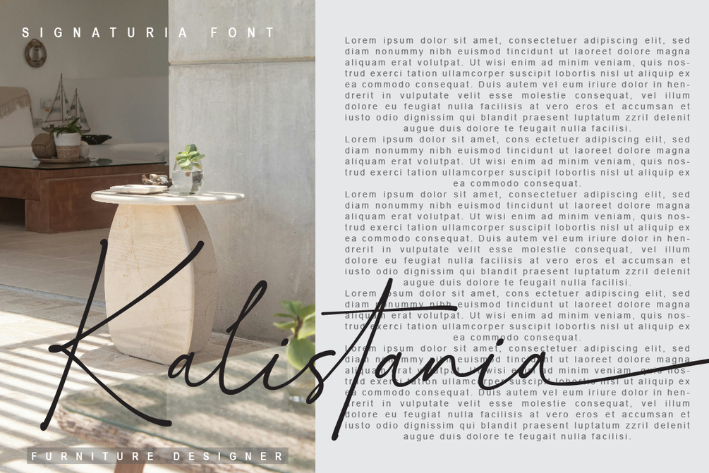 Signaturia is the perfect signature font, featuring a natural and stylish flow that showcases elegant tails at the beginning and end of each letter. It provides a binding element, allowing specific letter combinations to flow seamlessly for a more natural and authentic appearance, making it suitable for various projects that require a natural handwriting touch.